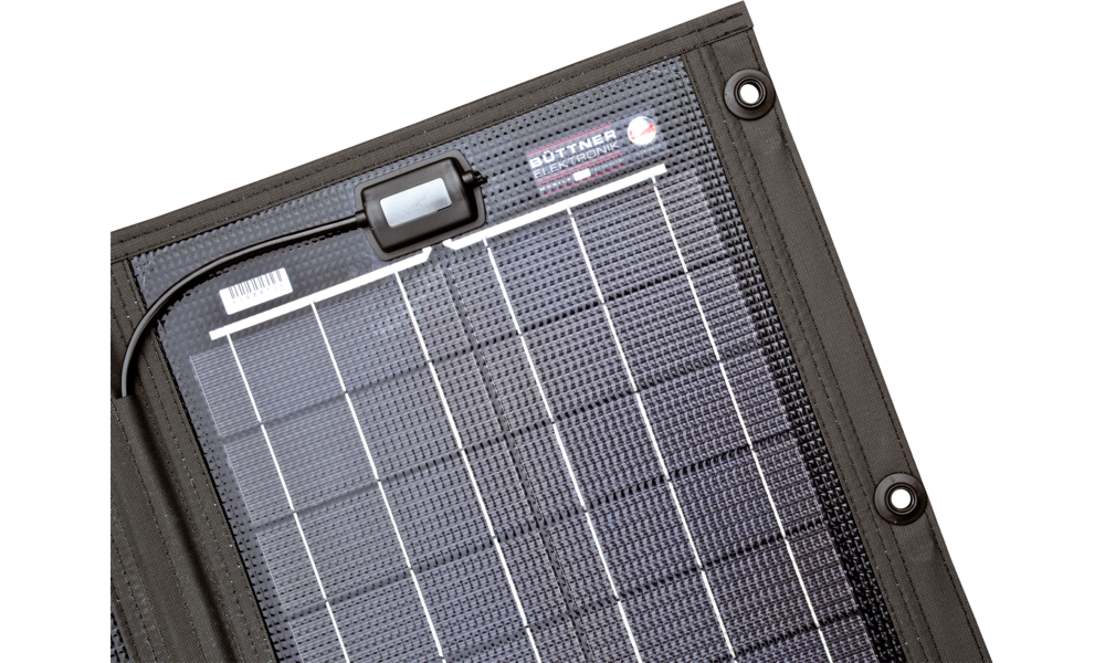 Ein weiteres Novum sind die im Gewebe integrierten Industriemagnete. Sie sorgen für starken Halt - etwa auf dem Kastenwagendach oder an der Fahrzeugseite, dabei schützt das Textilmaterial die lackierte Auflagefläche. Dank der eingearbeiteten TENAX®-Ösen können die Solarmodule aber auch ganz individuell befestigt werden, zum Beispiel mit Heringen am Sonnenplatz oder im Baum hängend, während das Fahrzeug selbst im Schatten steht. Ein 10 Meter langes Verbindungskabel macht es möglich und ein mobiler Solarregler (Batterietyp einstellbar), der jedem Solarmodul beiliegt, sorgt für die richtige Ladespannung.