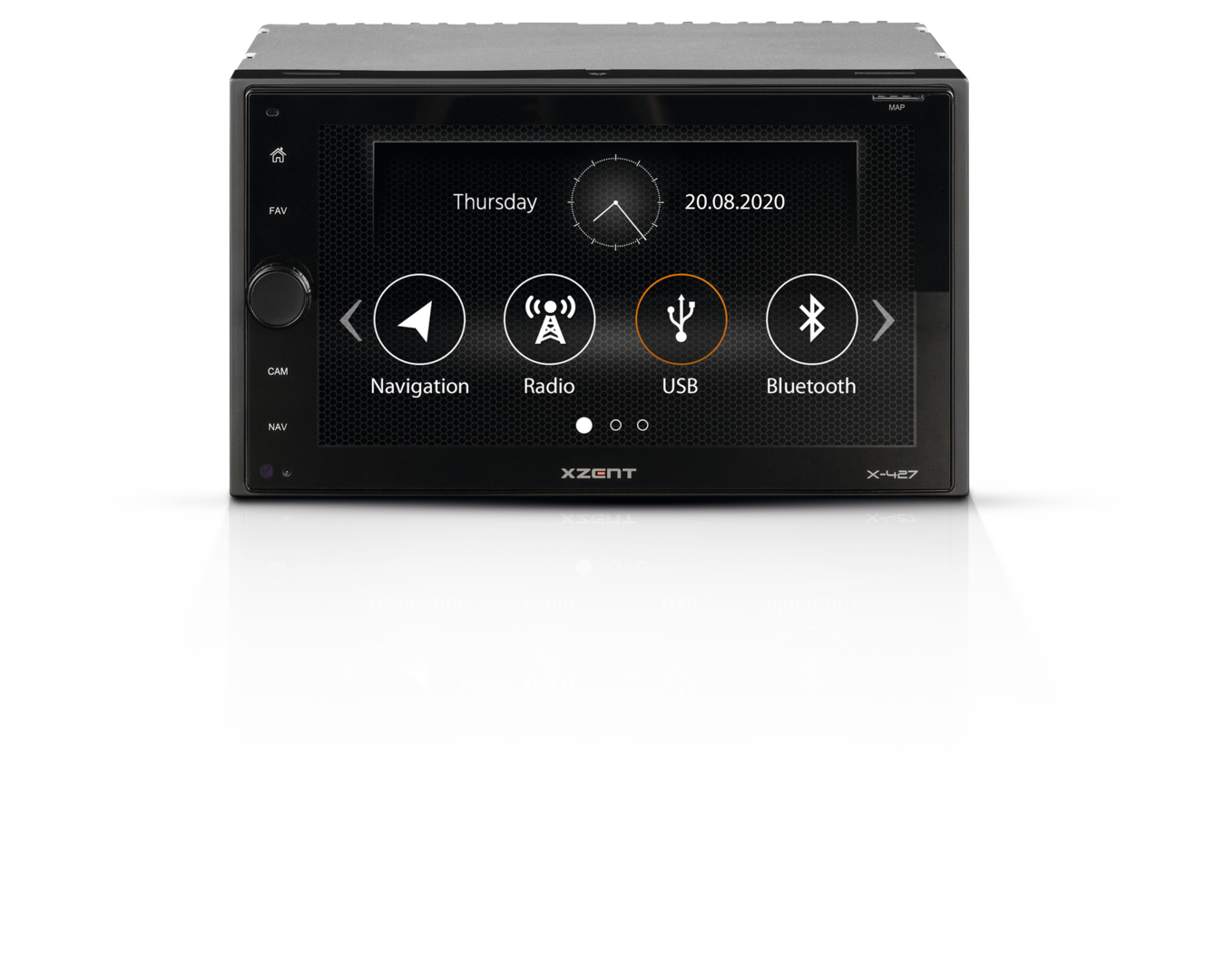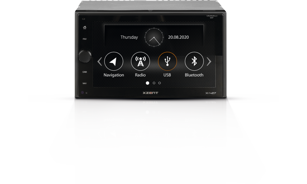 XZENTs Multimediasystem besticht mit einer übersichtlichen Gerätefront, die einen großen Touchscreen mit vier Sensortasten und einem Laustärkedrehregler kombiniert.