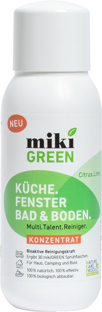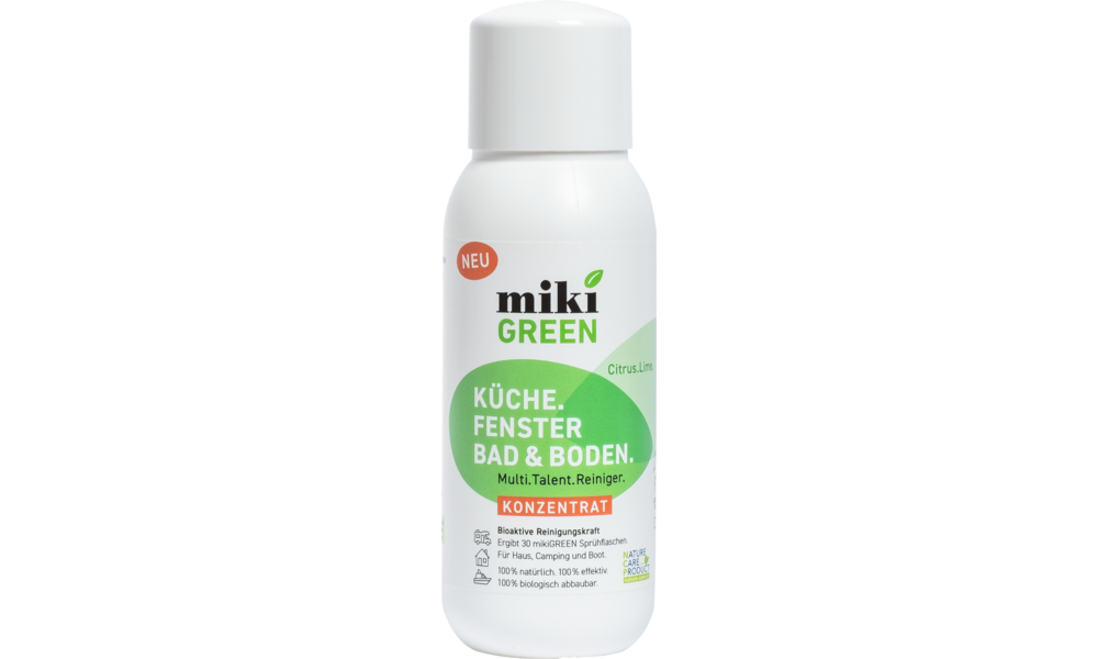 mikiGREEN Küche.Fenster.Bad & Boden. Säubert gründlich und nachhaltig Fenster, Glas, Holz, Edelstahl, Fliesen, Kunststoff, Keramik, Laminat und mehr. Als Konzentrat besonders ergiebig und günstig. Eine Flasche ergibt 9 Liter gebrauchsfertigen Reiniger.