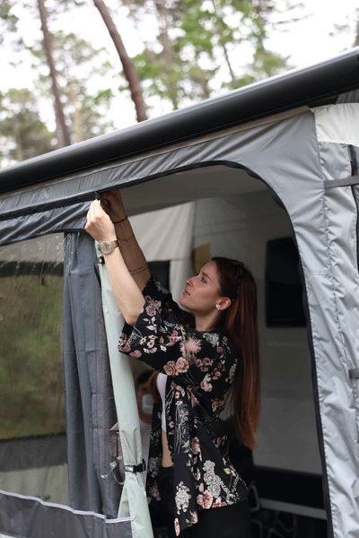 Dank der Dachlüftung besonders für warme Jahreszeiten geeignet. Das doppelte Dach, bestehend aus dem Markisentuch und dem Vorzeltdach aus Ripstop, schafft einen Hohlraum mit konstanter Belüftung, was somit die Innentemperatur auf ein angenehmes Maß reduziert.