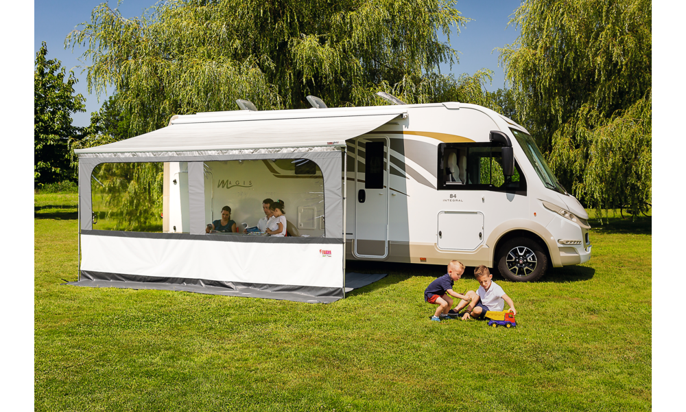 Aus wasserabweisendem, UV-beständigem Vinyl (90 % Polyvinylchlorid + 10 % Polyes-ter). Einfache Montage durch Einziehen in die Kederschiene. Inklusive Erdnägel und Spannbänder. Passend für F45S/L, F80S/L, F65S/L, CaravanStore, CaravanStore XL und F35 Pro. Höhe 200 cm. Für Anbauhöhe 225 - 280 cm.