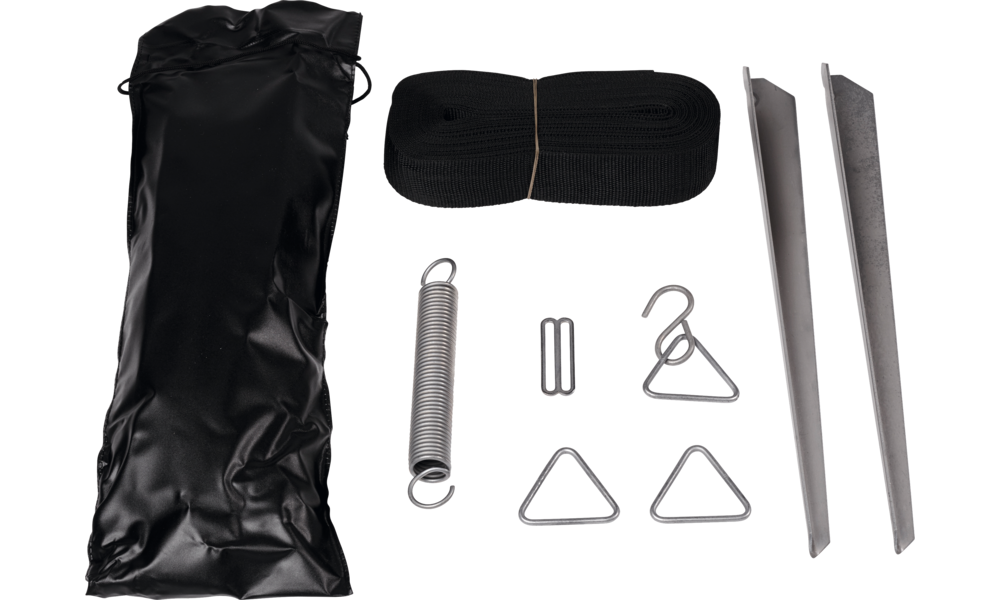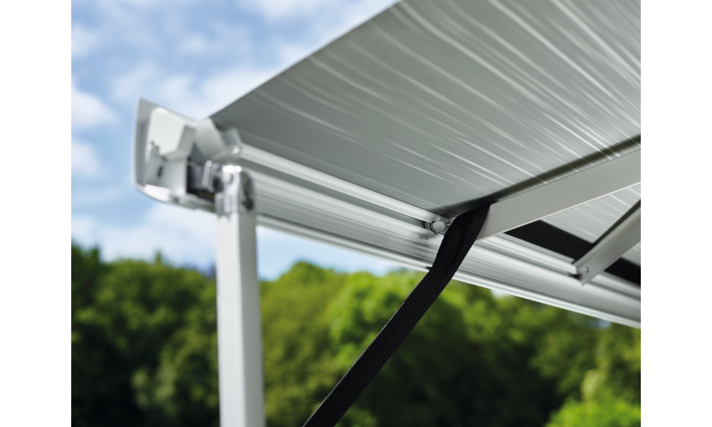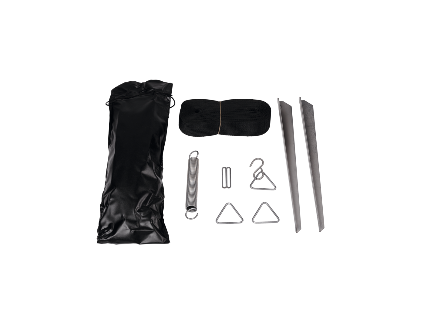 Sturmband Hold Down Kit. Mit diesem Halteset befestigen Sie Ihre Markise und es verhindert das Aufwehen. Es wird über die gesamte Länge der Markise zwischen den Gelenkarmen und dem Tuch befestigt. Besteht aus einem 11 m langen Gurt (100 % Polyester), Befestigungsmaterial, Heringen und einer Aufbewahrungstasche.
