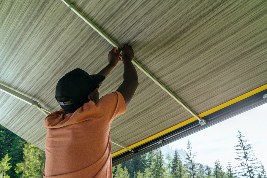 Der Rafter wird einfach ohne zu bohren quer zur Markise eingesetzt. Das Tuch wird auf Spannung gehalten, wodurch das Wasser schnell abläuft. Aus solidem Aluminium, serienmäßig mit Wandhalterungen zur Aufbewahrung im Fahrzeug.
