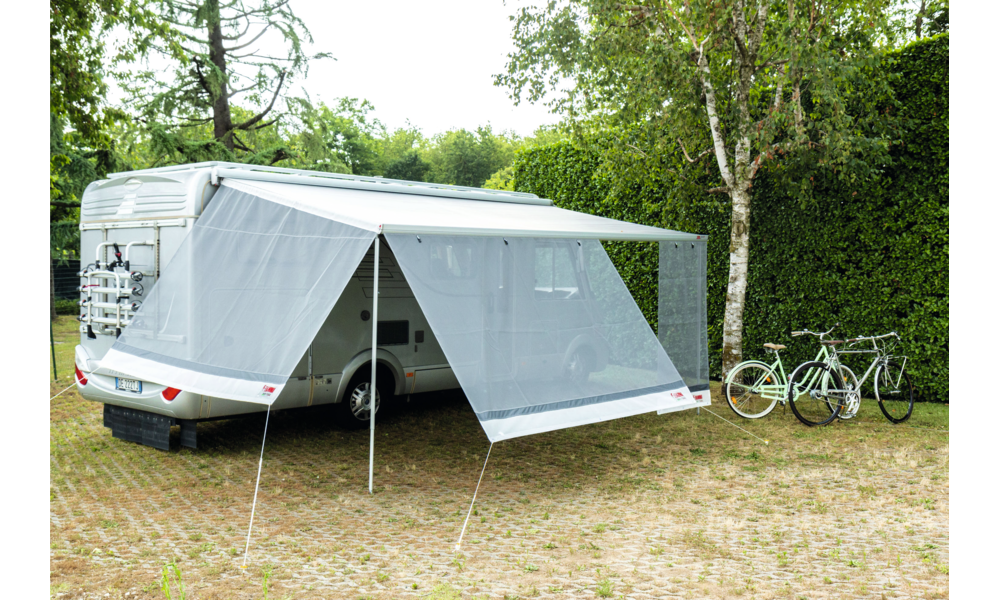 Seitenwand aus atmungsaktivem Maschengewebe (40 % Polyvinylchlorid + 60 % Polyester). Reflektiert 85 % des Lichts, sorgt für ein angenehmes Raumklima. Inklusive Spannstange aus Aluminium, Spannbänder und Erdnägel.