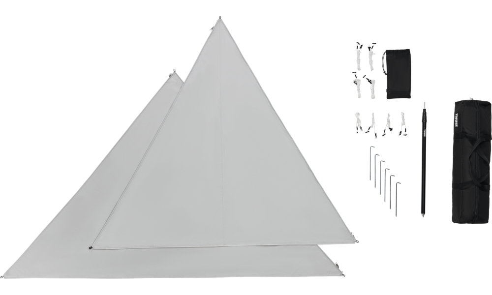 Thule Subsola Front Pack. Bestehend aus 1 x Large Paneel, 1 x Medium Paneel, 1 x Stützstange, Seile, Heringe und Aufbewahrungstasche.
