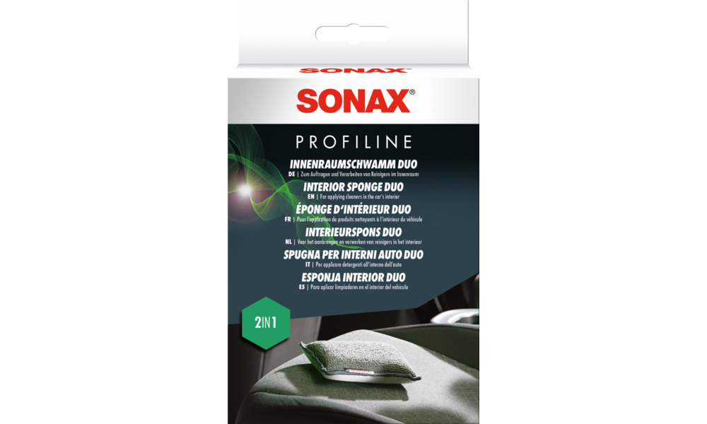 Weiße Seite mit feinen Nylonfasern für das Einmassieren von Reinigern auf Leder, Kunststoff oder Textilien. Graue Mikrofaserseite nimmt den gelösten Schmutz auf. Im Inneren befindet sich ein Schwammkern, der Flüssigkeit speichern kann.