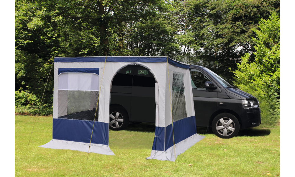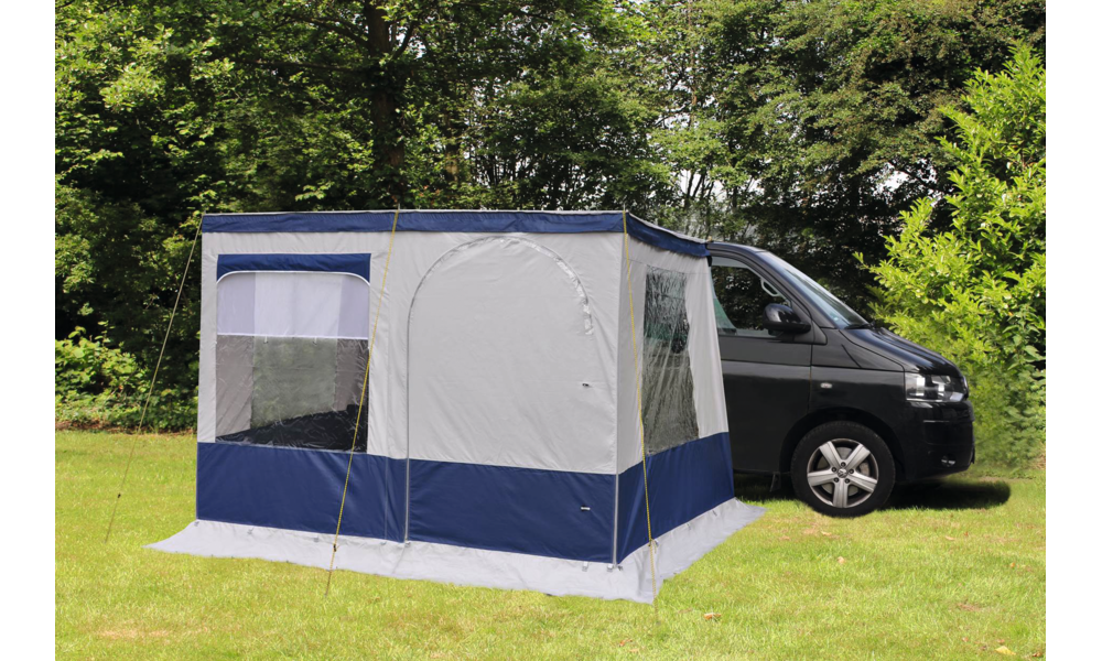Bestehend aus zwei Seitenwänden mit Klarsichtfenster und einer Vorderwand mit Eingangstür und großem Fenster.