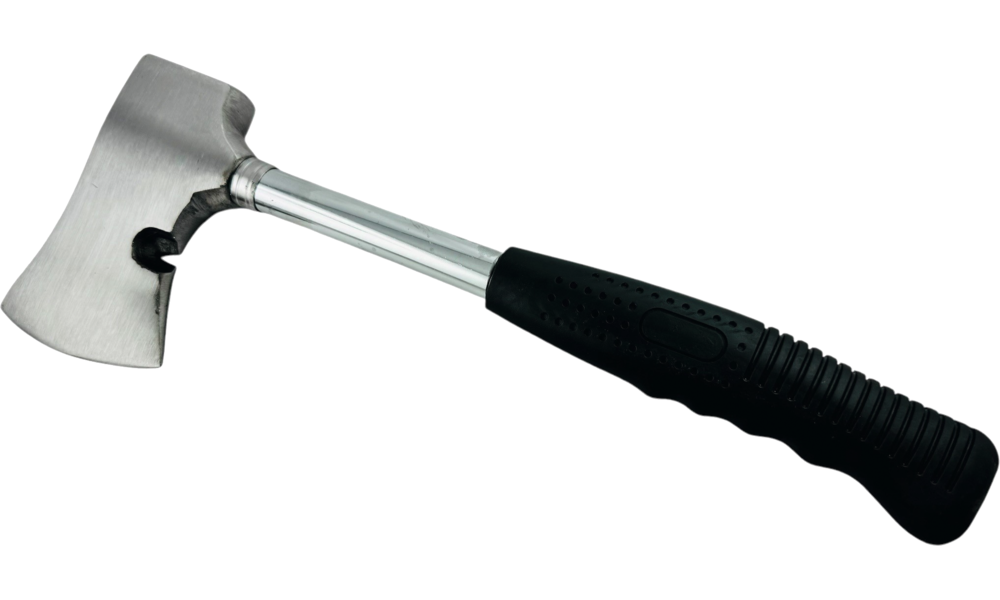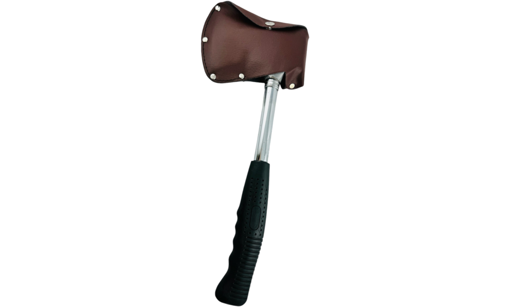 Sehr stabiles Stahlbeil mit rutschfestem Gummigriff, inklusive Schutztasche.