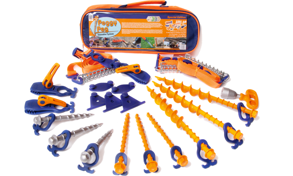 Inhalt: 3 Peggys N 20 cm, 3 HC Peggys 15 cm, 3 Peggys L 31 cm, 3 Crocodile Peggys, je 3 L- u. N-Haken, je 3 U- u. T-Connectors, Kombi Tool mit Aluadapter und Aufbewahrungstasche.