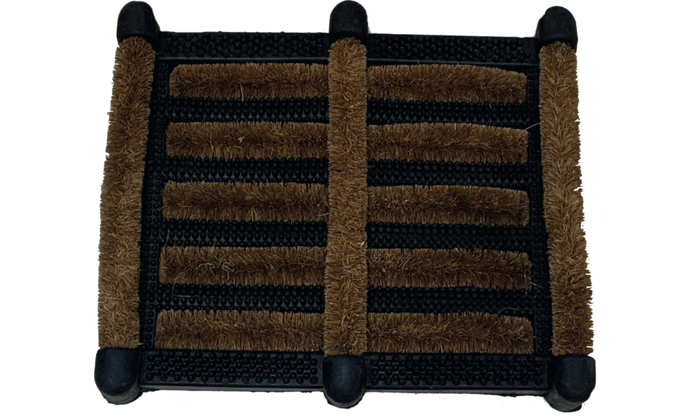 Schuhabstreifer mit Holzgestell. Unten und seitlich angebrachte Bürsten sorgen für die gründliche Reinigung beider Schuhe.