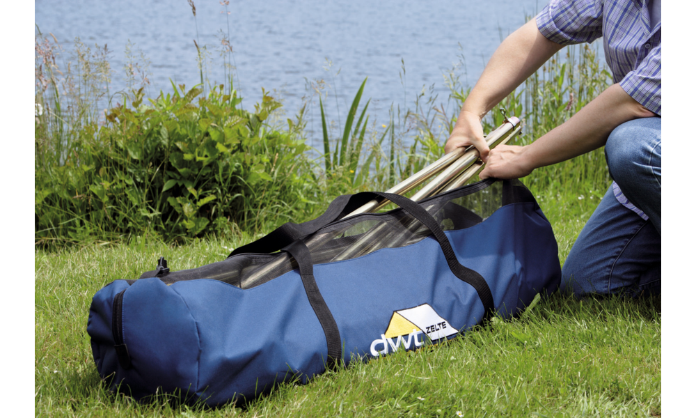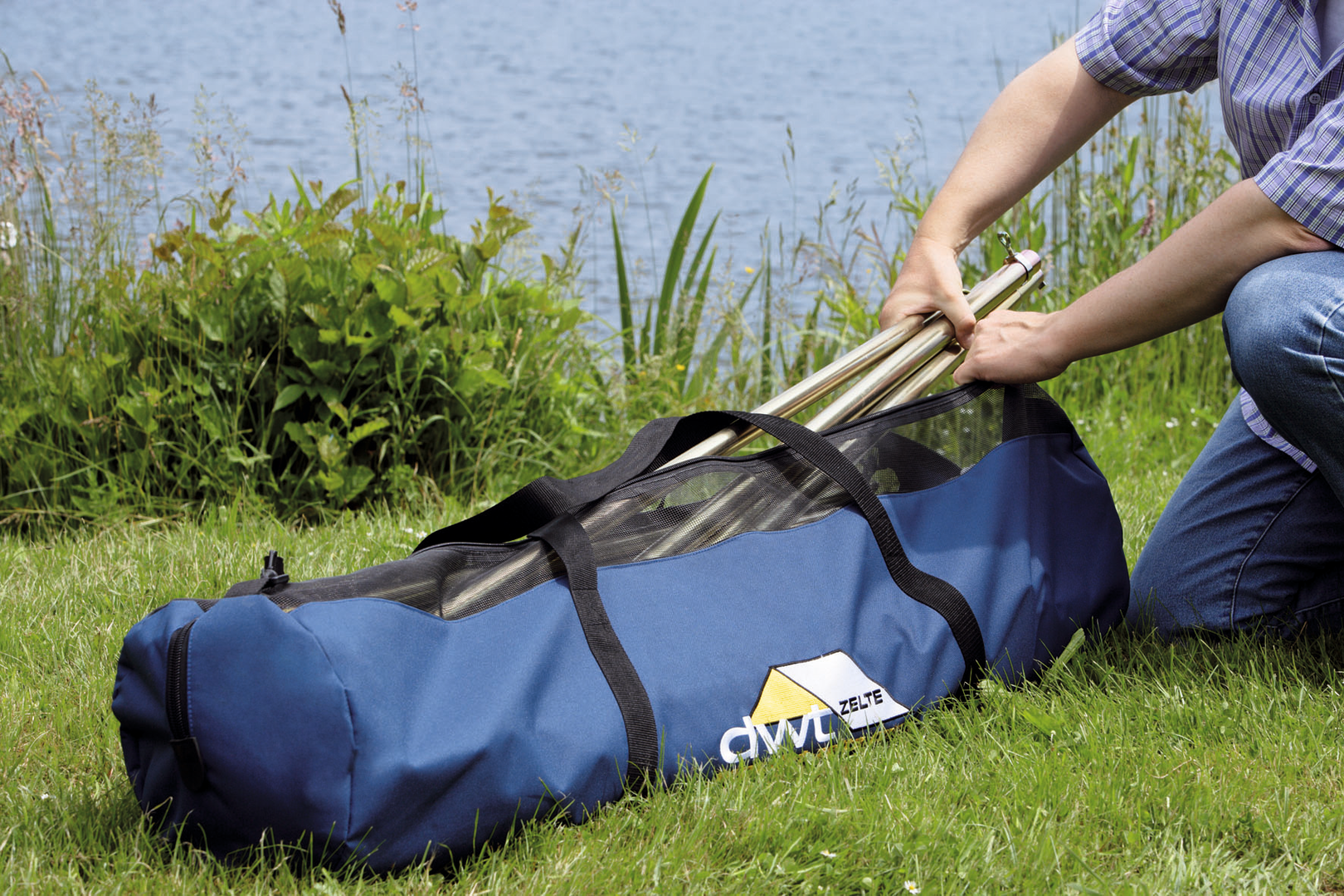 Zeltgestänge-Tasche aus robustem Oxford-Polyester,innen beschichtet. Breiter Lüftungsstreifen zur guten Belüftung. Mit verstellbarem Schultergurt.