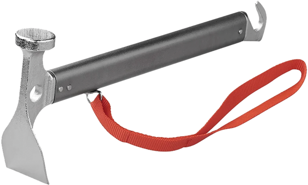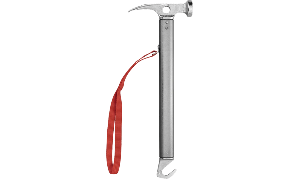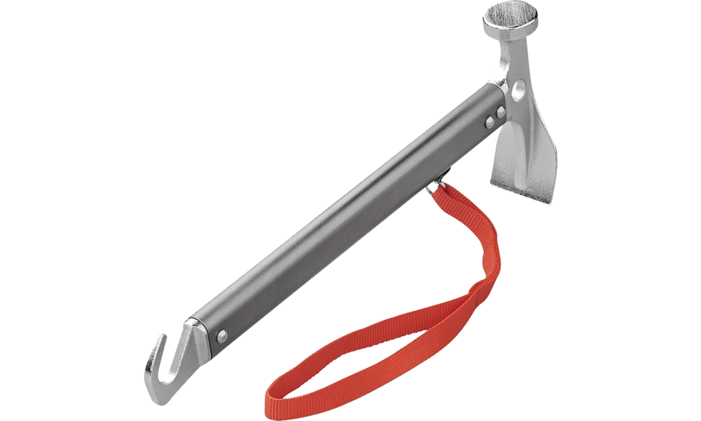 Leichter Aluminiumgriff, robuster Stahlkopf, Heringsauszieher und Sicherheits-Handschlaufe.