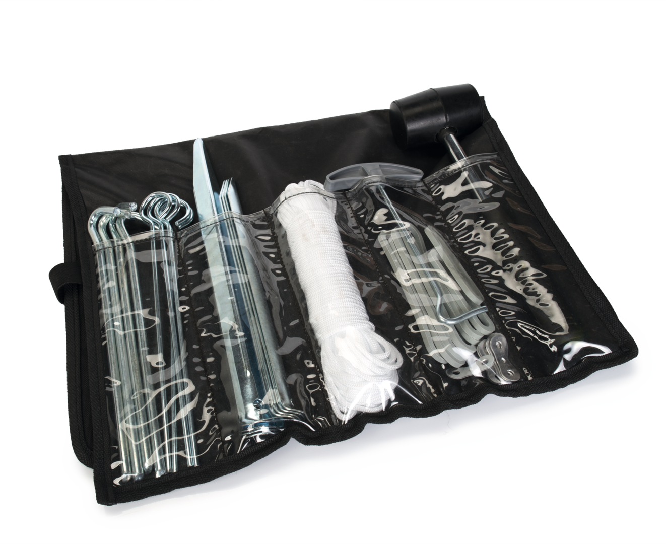 34-teiliges Zeltzubehöhr-Set. Ideal um Ihr Zelt auf unterschiedlichen Oberflächen zu befestigen.