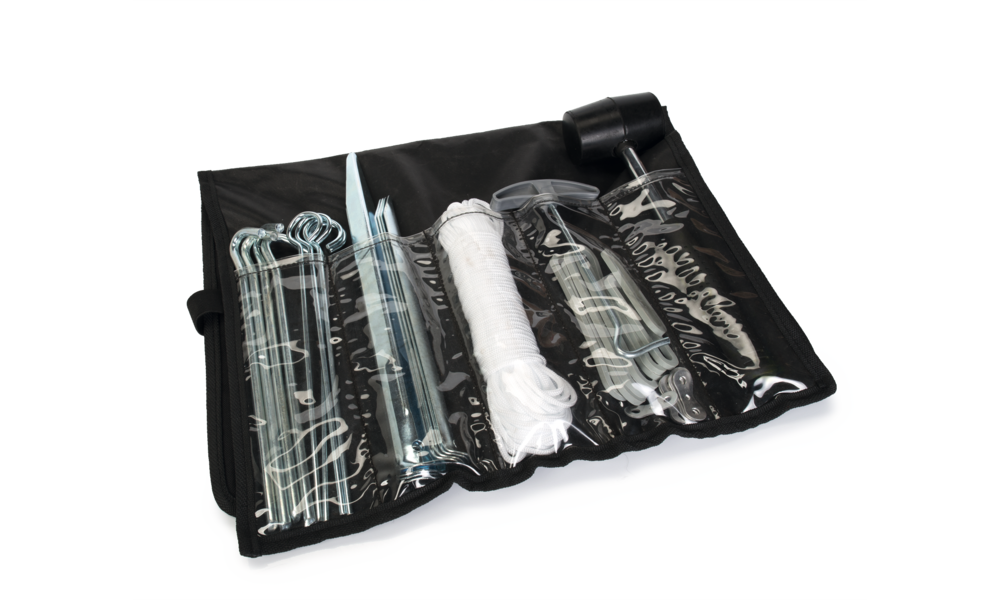 Enthält Heringe für harte und weiche Böden, Zelt-Spanngummis und 20 m Zeltschnur. Inklusive handlicher Tragetasche.